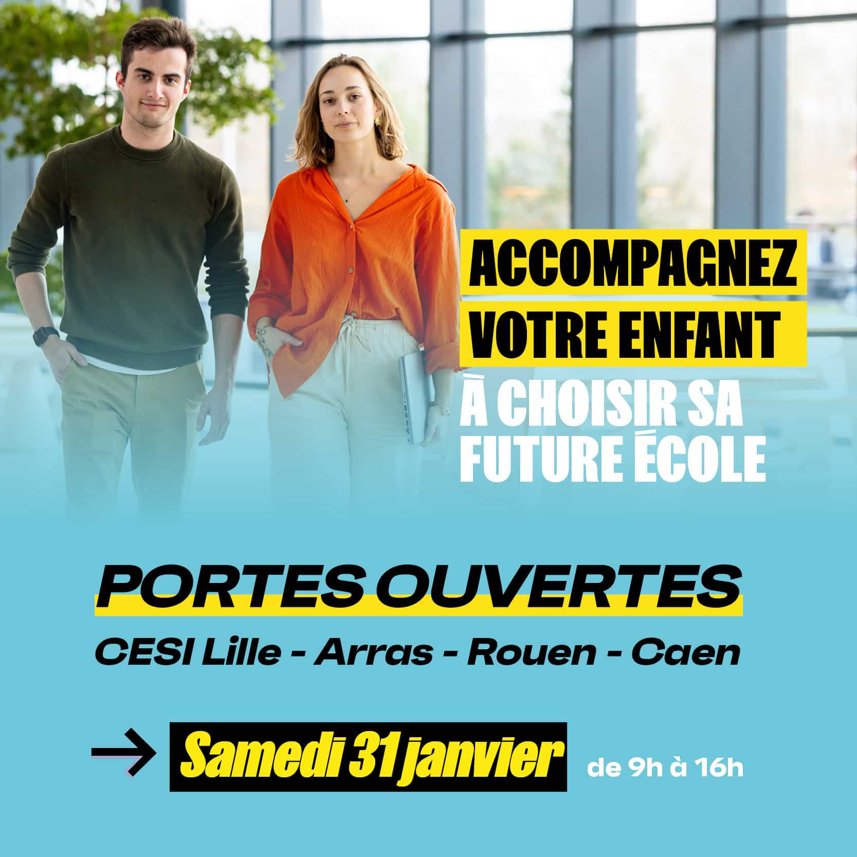 Le campus de CESI Caen vous ouvre ses portes le samedi 31 janvier de 9h à 16h pour une Journée Portes Ouvertes exceptionnelle. Venez échanger avec nos équipes pédagogiques et étudiants ambassadeurs, qui se feront un plaisir de répondre à toutes vos questions, de vous conseiller sur les choix de formation, et de vous orienter vers le cursus qui correspond au projet professionnel de votre enfant.